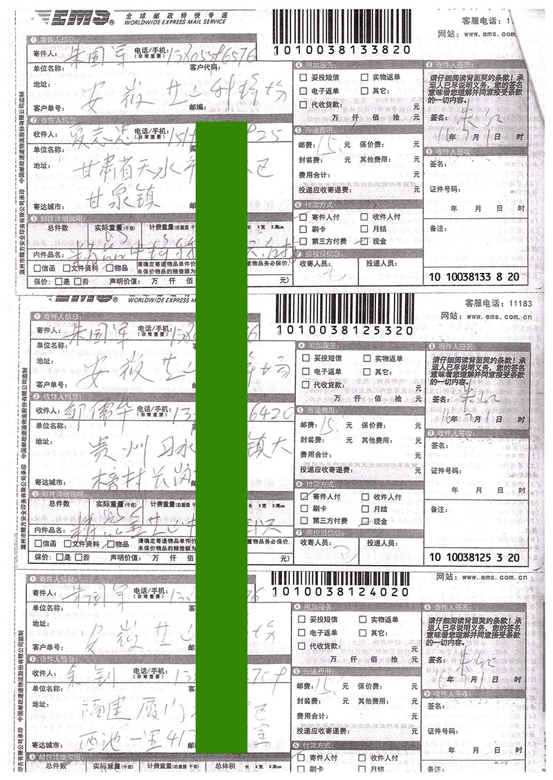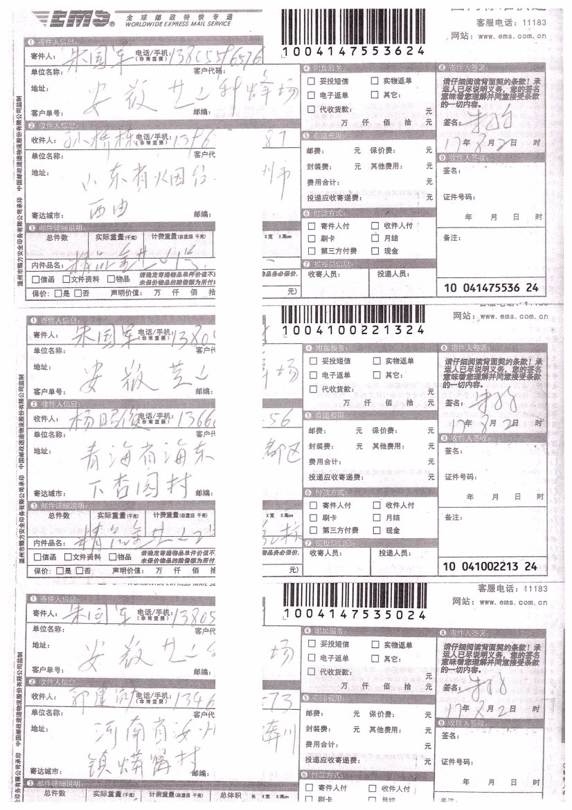 感谢全国各地蜂友20多年来对黄山种蜂场的支持与厚爱。养蜂谚语:一只好王,万斤蜜糖!亚洲优秀蜂农——朱国军本着对蜜蜂育种事业的热爱和执着,把质量第一放在首位,尽心尽力为蜂友服务。我们始终把用户的蜂群当作自己的蜂群对待,蜂友们丰收了,就是我们丰收了。严把质量关,邮寄(经鉴定筛选两个月以上)遗传性状稳定的精品种蜂王、拔尖种蜂王。为广大蜂友在养蜂脱贫致富奔小康大道上快马加鞭。以下为2016-2018年部分蜂友邮寄的中、西种蜂王的EMS详情单。